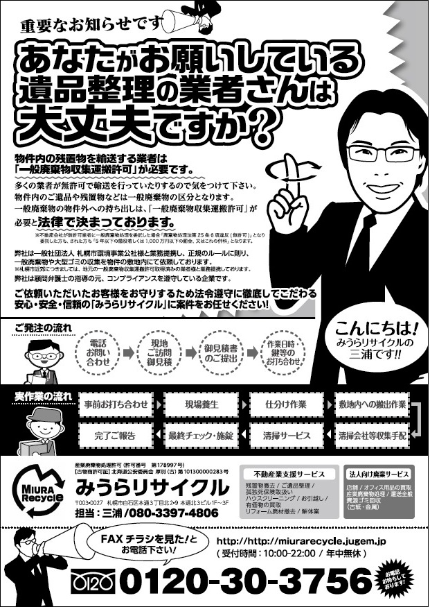 [みうらリサイクル]◇札幌の片付け・遺品整理が最低料金 税別7千5百円〜業界最安値を実現!◇ | 2015.10.06 Tue 15:06