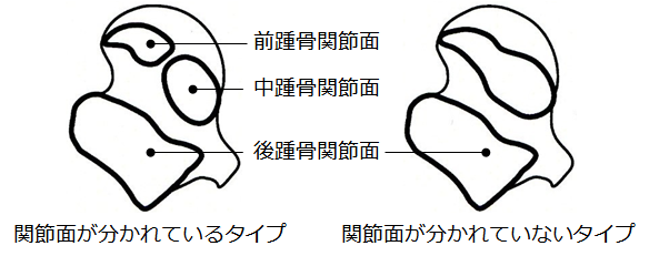 JUGEMテーマ:インソール(足底板) 距骨の続きです。 距骨は、下図のように、踵骨の上に乗っている小さな骨でしたね? 距骨を下から覗いてみましょう。 下図のように、解剖学の教科書には、踵骨と前中後の 3個 の関節面で接していると書かれています。 前回、距骨には変形が多いという話をしました。 まず、前踵骨関節面が、舟状骨と接する関節面と一緒になっているものが多いこと。 次に、距骨の関節面は、3個に分かれているとは限らない・・・ むしろ、3個である方...