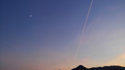 ようやく暑く長かった夏休みが終わり ほっと肩の荷がおりた気分です。 朝陽や夕陽を見ながら散歩するのが 私の至福の時ですが この夏休みは、 ほぼ毎日息子関連の出事があり 夕方はクタクタ、朝は6時に起きるのが精いっぱい 今日ようやく久しぶりに夕方散歩に出かけました。 もう白く光る三日月が出ていて その横に夕陽に映えピンクに染まった飛行機雲は まっすぐに高く高く昇る龍のよう 本当はもっと大きいんですが左の白い点が三日月 大き...