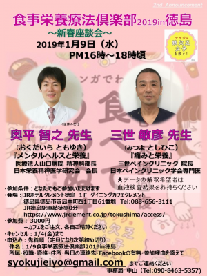 JUGEMテーマ:食事・栄養療法 【食事栄養療法倶楽部2019in徳島】 ※会場予約の為、『参加ボタン』だけでは、お申込みが完了いたしません。事務局へのお申込みが必要です。 〜新春座談会〜 日時:2019年1月9日(水) 16時〜18時頃 ○奥平 智之 先生 (おくだいら ともゆき) 医療法人山口病院 精神科部長 日本栄養精神医学研究会 会長 http://mhealth.jugem.jp https://www.dr-okudaira.com https://twitter.com/...