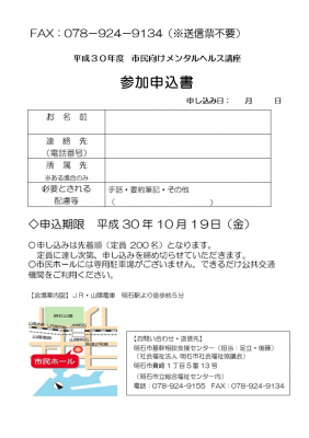 JUGEMテーマ:食事・栄養療法 2018 市民向けメンタルヘルス講座にて講師を務めます 後援タイトル:『食べてうつぬけ〜鉄欠乏女子(テケジョ)・子ども(テケコ)を救え!〜』 日時:10 月 24 日(水) 14:00〜16:00(受付 13:30〜) 会場:「市民ホール」らぽす5階 明石市本町1丁目1−32 JR・山陽電車 明石駅より徒歩約5分 主催:明石市地域自立支援協議会 くらし部会 「ハートフルあかし」 【お申込み方法】 ●参加申込書(...