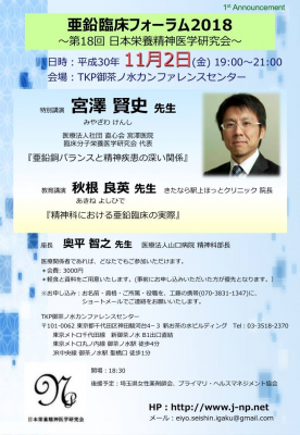 JUGEMテーマ:食事・栄養療法 【第16回 日本栄養精神医学研究会】 日時:平成30年10月4日(木) 19:00〜21:00 (開場18:30) 〜プログラム〜 座長 安田 貴昭 先生 埼玉県医科大学総合医療センター メンタルクリニック 講師 《教育講演》 『亜鉛とメンタルヘルス』 奥平 智之(おくだいら ともゆき)先生 医療法人 山口病院 精神科部長 日本栄養精神医学研究会 会長 《特別講演》 『認知症と亜鉛〜リコード法を交えて〜』 今野 裕之...