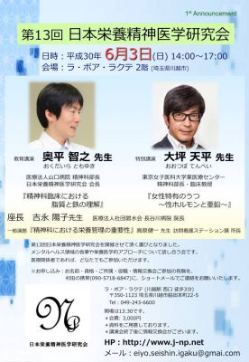 JUGEMテーマ:食事・栄養療法 ★事前のお申し込みが必要です★ ご参加ご希望の方は、お早目にお申し込みをお願いいたします。 お名前・資格・ご所属・役職・情報交換会ご参加の有無を、村田の携帯(090-5718-6847)に、ショートメールでご連絡お願いいたします。 【第13回 日本栄養精神医学研究会】 日時:平成30年6月3日(日) 14:00〜17:00 会場:ラ・ボア・ラクテ 2階 (埼玉県川越市) 座長 吉永 陽子 先生 (よしなが ようこ)先生 医療法人社団碧水会 長谷川病院 院長 一般...