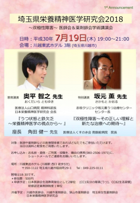 JUGEMテーマ:食事・栄養療法 ※事前のお申し込みが必要です お名前・資格・ご所属・役職を、磯谷の携帯(080-2506-1973)に、ショートメールでご連絡をお願いいたします。 【埼玉県栄養精神医学研究会 2018】 〜双極性障害〜 医師会&薬剤師会学術講演会 日時:平成30年 7月19日(木) 19:00〜21:00 会場:川越東武ホテル 3階 (埼玉県川越市) 座長 角田健一 先生 医療法人くすのき会 南飯能病院 院長 教育講演 『うつ状態と鉄欠乏〜栄養精神医学の視点か...