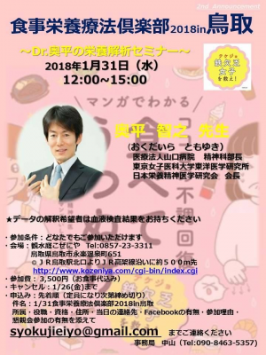 JUGEMテーマ:食事・栄養療法 【食事栄養療法倶楽部2018in鳥取】 ※会場予約の為、事務局へのお申込みが必要です。 〜Dr.奥平の栄養解析セミナー〜 日時:2018年1月31日(水) 12:00~15:00 ○奥平 智之 先生 (おくだいら ともゆき) 医療法人山口病院 精神科部長 東京女子医科大学東洋医学研究所 日本栄養精神医学研究会 会長 https://www.kamponavi.com/m/doctor/d13yama.html http://mhealth.jugem.jp/ https...