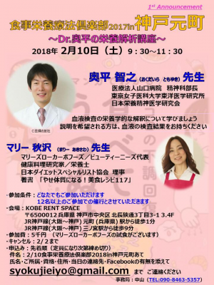 JUGEMテーマ:食事・栄養療法 【食事栄養療法倶楽部2018in神戸三宮】 ※会場予約の為、事務局へのお申込みが必要です。 〜Dr.奥平の栄養解析講座〜 日時:2018年2月10日(土) 9:30~11:30 ○奥平 智之 先生 (おくだいら ともゆき) 医療法人山口病院 精神科部長 東京女子医科大学東洋医学研究所 日本栄養精神医学研究会 会長 https://www.kamponavi.com/m/doctor/d13yama.html http://mhealth.jugem.jp/ &nb...