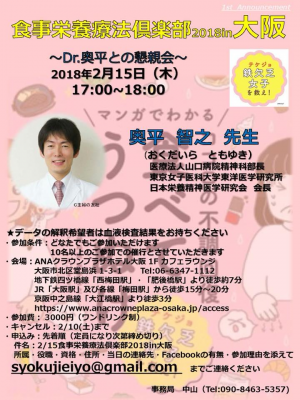 JUGEMテーマ:食事・栄養療法 【食事栄養療法倶楽部2018in大阪】 ※会場予約の為、事務局へのお申込みが必要です。 〜Dr.奥平との懇親会〜 日時:2018年2月15日(木) 17:00~18:00 ○奥平 智之 先生 (おくだいら ともゆき) 医療法人山口病院 精神科部長 東京女子医科大学東洋医学研究所 日本栄養精神医学研究会 会長 https://www.kamponavi.com/m/doctor/d13yama.html http://mhealth.jugem.jp/ https://twitter.com/syokujiei...