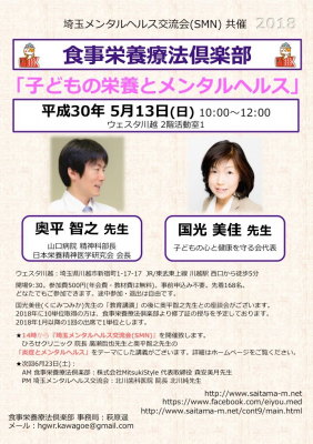 JUGEMテーマ:食事・栄養療法 【国光美佳先生&奥平智之先生座談会】 食事栄養療法倶楽部2018in埼玉 平成30年5月13日(日)AM 9:30開場 10:00〜12:00 座談会 「子どもの栄養とメンタルヘルス」 〇国光美佳(くにみつみか)先生 子どもの心と健康を守る会 代表 https://www.mineral-heart.com ◯奥平智之(おくだいらともゆき)先生 医療法人山口病院 精神科部長 日本栄養精神医学研究会 会長 会場:ウェスタ川越 2階 活動室1 埼玉県川越市新宿町1-17-17 JR・東武東上線:川越駅 西口...