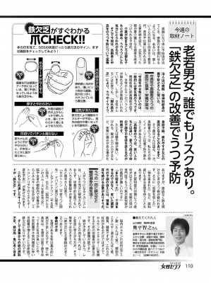 JUGEMテーマ:食事・栄養療法 メディア掲載情報|女性セブン2017年12月21日号 【明日は我が身の伴奏介護-N記者の実録奮闘記!FILE19】 ◎高齢者のうつ、介護家族のうつ、もしかしたら鉄不足が一因かも ◎老若男女、だれでもリスクあり。「鉄欠乏」の改善でうつ予防