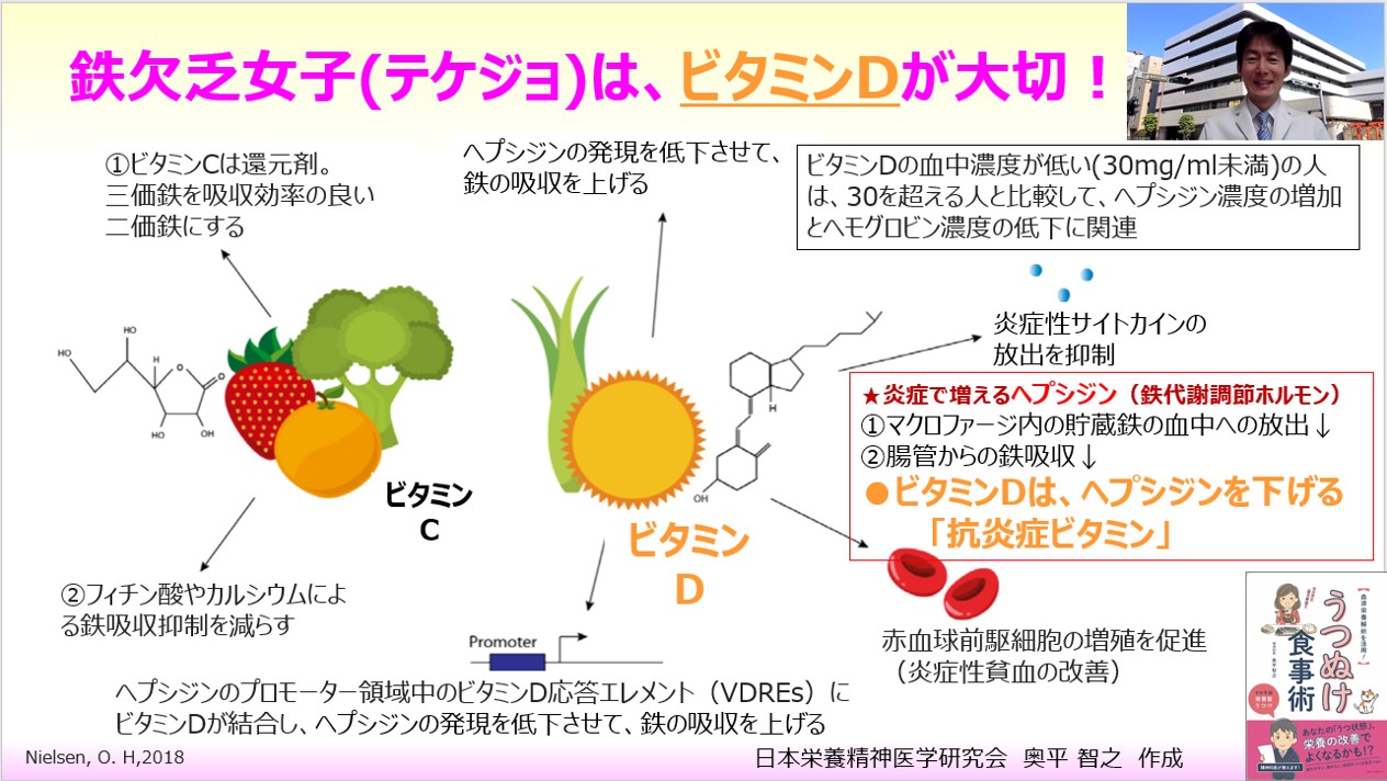 JUGEMテーマ:食事・栄養療法 https://www.dr-okudaira.com/post/iron_and_vitamin_d 鉄欠乏女子(テケジョ)は、ビタミンD(日光ビタミン)が大切。 にもかかわらず、ビタミンD欠乏女子(デケジョ)は多い。 D欠乏は鉄欠乏の回復の阻害因子です。 ビタミンDは、テケジョをサポートする大切な抗炎症ビタミン(鉄吸収促進ビタミン)です。 【テケジョおけるビタミンDの効用】 ?炎症で増えるヘプシジン(鉄代謝調整ホルモン)の発現を低下・・・ヘプシジンのプロモーター領域中のビタミ...