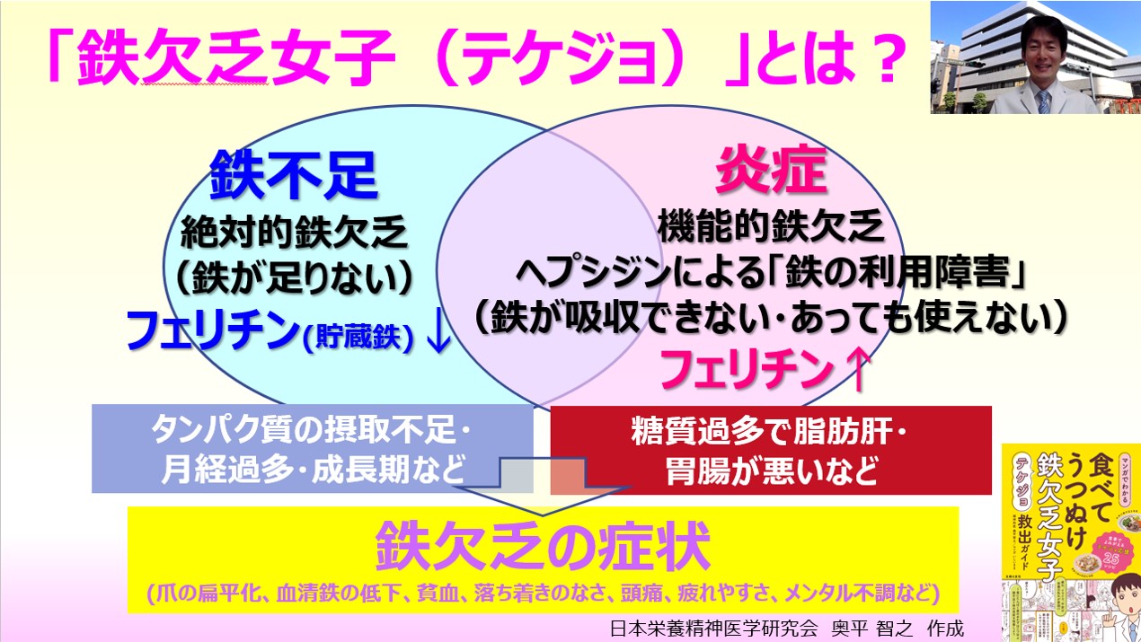 JUGEMテーマ:食事・栄養療法 https://www.dr-okudaira.com/post/what_is_tekejo https://www.youtube.com/watch?v=6Fpl8v4xgMU&t=11s 鉄欠乏状態には、?絶対的鉄欠乏と?機能的鉄欠乏(炎症による鉄の利用障害)の2つがあります。 鉄欠乏女子(テケジョ)の多くは、絶対的鉄欠乏がありますが、慢性炎症を伴っている人もいます。例えば、スイーツなどの糖質過多による肝臓の炎症、胃腸が悪いなど・・・。このような「炎症型テケジョ」は、フェリチン(貯蔵鉄)が高めになってい...