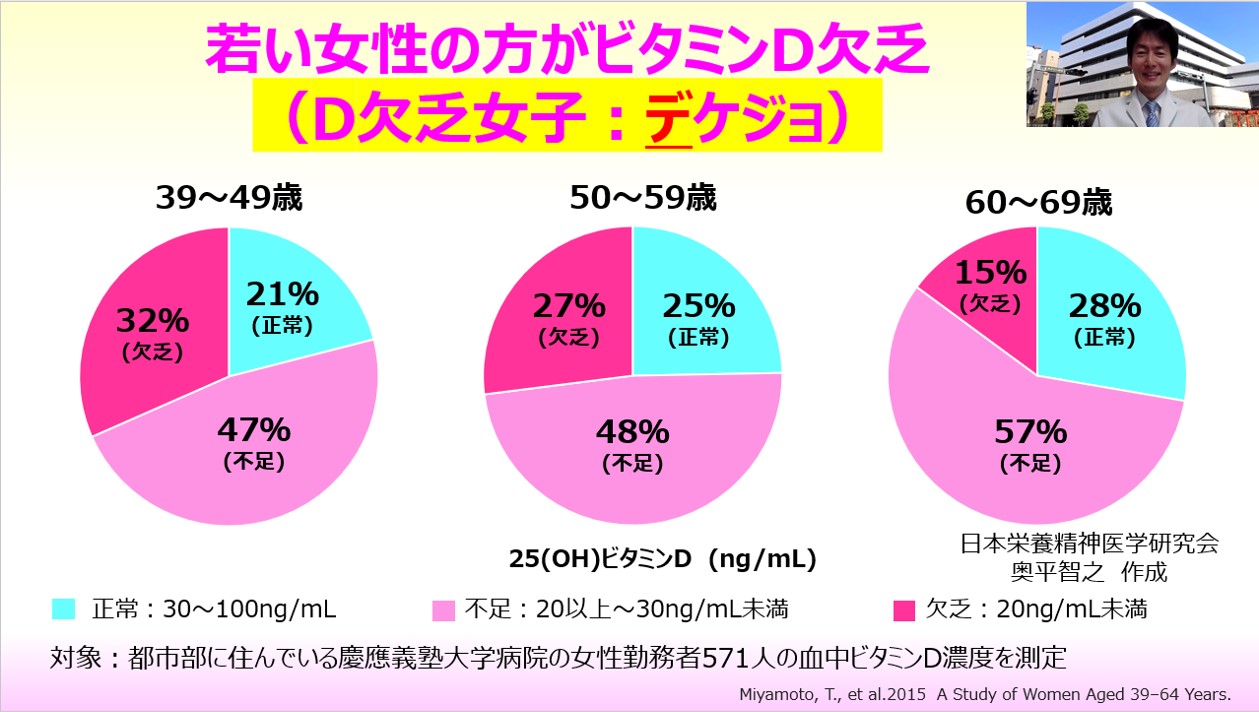 JUGEMテーマ:食事・栄養療法 https://www.dr-okudaira.com/post/iron_deficiency_and_energy_deficiency 都市部に住んでいる慶應義塾大学病院の女性勤務者571人の血中ビタミンD濃度を測定したところ、若い世代の女性の方が、「ビタミンD欠乏」が多かったという結果でした。 39〜49歳のビタミンD欠乏女子(デケジョ)は32%であり、60〜69歳の女性の2倍でした。 ビタミンD不足も入れると、なんと8割近くの方がビタミンD(日光ビタミン)を補う必要があります。 お肌を紫外線から守るために...