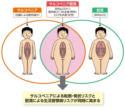 JUGEMテーマ:食事・栄養療法 【サルコぺニア肥満とは?】 サルコペニア(加齢に伴う筋肉量の減少)の放置によって転倒・骨折やフレイル(虚弱)の問題につながります。 ○「サルコペニア肥満」の基準 次の2つの条件の両方に該当すればサルコペニア肥満となる 1 体重当たりの骨格筋量の割合(筋肉率)が、男性で27.3%未満、女性で22.0%未満 2 BMI[体格指数:体重(kg)身長(m)2]が25以上 *筑波大学久野研究室データより ○サルコペニア肥満になると、サルコペニアによる転倒・骨折などの...