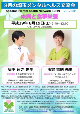 JUGEMテーマ:食事・栄養療法 ◎未病と食事栄養◎ 南雲吉則先生・奥平智之先生講義:8月埼玉メンタルヘルス交流会2017 〜プログラム〜 《教育講演》「予防医療における栄養解析の実際」 奥平智之(おくだいらともゆき)先生 医療法人山口病院 精神科部長 東京女子医科大学東洋医学研究所 https://www.kamponavi.com/m/doctor/d13yama.html 《特別講演》「大切な人を守るために今できること」 ナグモクリニック 総院長 一般社団法人 命の食事 代表理事 南雲吉則 (なぐもよしのり)先生 http://www.na...