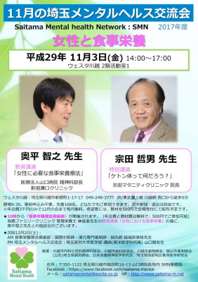 JUGEMテーマ:食事・栄養療法 ◎女性と食事栄養◎宗田哲男先生・奥平智之先生講義:11月埼玉メンタルヘルス交流会2017 〜プログラム〜 《教育講演》「女性に必要な食事栄養療法」 奥平 智之(おくだいら ともゆき)先生 医療法人山口病院 精神科部長 東京女子医科大学東洋医学研究所 https://www.kamponavi.com/m/doctor/d13yama.html 《特別講演》「ケトン体って何だろう?」 宗田 哲男(むねた てつお)先生 宗田マタニティクリニック 院長 http://muneta.org 平成29年11月3日(金)14:00〜...