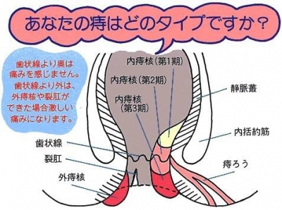 JUGEMテーマ:食事・栄養療法 【痔 の理解】 ★痔はなぜ起こるのでしょうか?★ 肛門のまわりには、細い静脈がモツレた毛糸のように(静脈叢という)入り組んでおり、この静脈は、他の静脈のような逆流防止の弁がありません。 そのため、わずかな障害で、血液が逆流して静脈瘤(うっ血)ができるのです。 このうっ血が、痔の第一原因です。 うっ血の原因として、長時間の立ち仕事、冷え、便秘、妊娠などがあげられます。 ★あなたはどのタイプ?★ 内痔核(はしり痔)(第1期) 痛みはほとん...
