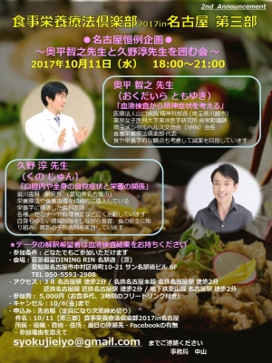 JUGEMテーマ:食事・栄養療法 【食事栄養療法倶楽部2017in名古屋 第三部】 ※会場予約の為、『参加ボタン』だけでは、お申込みが完了いたしません。事務局へのお申込みが必要です。 ●名古屋恒例企画● 〜奥平智之先生と久野淳先生を囲む会 〜 日時:2017年10月11日(水) 18:00〜21:00 ○奥平 智之 先生 (おくだいら ともゆき)...