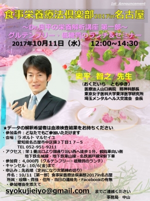 JUGEMテーマ:食事・栄養療法 【食事栄養療法倶楽部2017in名古屋〜第一部・グルテンフリー・低糖質のランチ&セミナー〜】 ※会場予約の為、『参加ボタン』だけでは、お申込みが完了いたしません。事務局へのお申込みが必要です。 〜Dr.奥平の栄養解析講座 第一部〜 グルテンフリー・低糖質のランチ&セミナー 日時:2017年10月11日(水) 12:00~14:30 ○奥平 智之 先生 (おくだいら ともゆき) 医療法人山口病院 精神科部...