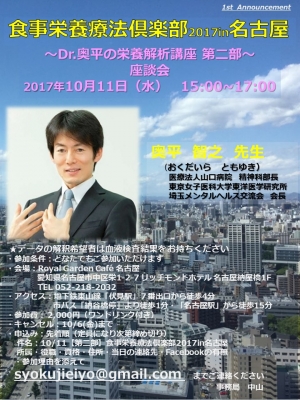 JUGEMテーマ:食事・栄養療法 【食事栄養療法倶楽部2017in名古屋〜第二部 座談会〜】 ※会場予約の為、『参加ボタン』だけでは、お申込みが完了いたしません。事務局へのお申込みが必要です。 〜Dr.奥平の栄養解析講座 第二部〜座談会 日時:2017年10月11日(水) 15:00~17:00 ○奥平 智之 先生 (おくだいら ともゆき) 医療法人山口病院 精神科部長 東京女子医科大学東洋医学研究所 埼玉メンタル...