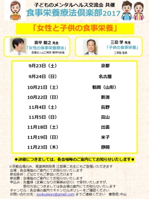 JUGEMテーマ:食事・栄養療法 食事栄養療法倶楽部2017「女性と子供の食事栄養」 子どものメンタルヘルス交流会共催 ○日程・会場○ 9月23日(土) 京都 9月24日(日) 名古屋 10月21日(土) 鶴岡(山形) 10月22日(日) 新潟 ...