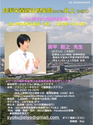 JUGEMテーマ:食事・栄養療法 【食事栄養療法倶楽部2017in北上(岩手)】 ※ランチ予約の為、『参加ボタン』だけでは、お申込みが完了いたしません。事務局へのお申込みが必要です。 〜Dr.奥平の栄養解析講座〜 日時:2017年10月18日(水) 12:00〜14:30 ○奥平 智之 先生 (おくだいら ともゆき) 医療法人山口病院 精神科部長 東京女子医科大学東洋医学研究所 埼玉メンタルへルス交流会 会長 ...