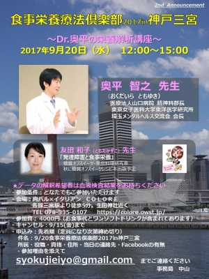 JUGEMテーマ:食事・栄養療法 【食事栄養療法倶楽部2017in神戸三宮】 〜Dr.奥平の栄養解析講座〜 日時:2017年9月20日(水) 12:00〜15:00 ○奥平 智之 先生 (おくだいら ともゆき) 医療法人山口病院 精神科部長 東京女子医科大学東洋医学研究所 埼玉メンタルへルス交流会 会長 https://www.kamponavi.com/m/doctor/d13yama.html http://mhealth.jugem.jp/ https://twitter.com/syok...