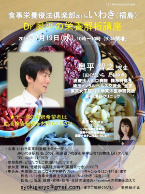 JUGEMテーマ:食事・栄養療法 【食事栄養療法倶楽部2017inいわき(福島)】 〜Dr.奥平の栄養解析講座〜 2017年7月19日(水) 10時〜13時(9:45会場) ≪教育講演≫ 奥平 智之(おくだいらともゆき)先生 医療法人山口病院 精神科部長 (埼玉県) 東京女子医科大学東洋医学研究所 新宿溝口クリニック 埼玉メンタルへルス交流会 会長 https://www.kamponavi.com/doctor/d65mizoguchi.html ★データの解釈希望者は血液検査結果をお持ちください ☆Dr.奥平...