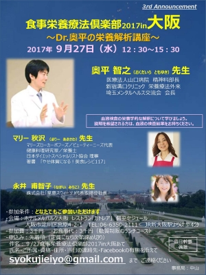 JUGEMテーマ:食事・栄養療法 【Dr.奥平の栄養解析講座】 食事栄養療法倶楽部2017in大阪 2017年 9月27日(水)12:30〜15:30 〇奥平智之(おくだいらともゆき)先生 医療法人山口病院 精神科部長 東京女子医科大学東洋医学研究所 埼玉メンタルへルス交流会 会長 ☆Dr.奥平 プロフィール☆彡 https://www.kamponavi.com/m/doctor/d13yama.html ★Dr.奥平 講座案内★ http://mhealth.jugem.jp ☆Twitter/食事栄養療法倶楽部 Dr.奥平☆ https://twitte...