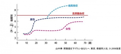 JUGEMテーマ:食事・栄養療法 【尿酸と性差】 ●女性の高尿酸血症の頻度は男性に比べて非常に低いですが、閉経後、尿酸値は徐々に増加し男女差は小さくなります。 これは閉経に伴ってエストロゲンの分泌が低下し、『エストロゲンによる尿酸排泄作用』が減少するためと考えられています。 ●女性痛風は男性痛風に比べて二次性痛風が多いことが明らかとなっています。 その二次性痛風の原因としては、腎機能障害と薬剤性(利尿薬の服用)があげられます。 そのため、女性の高尿酸血症においては、腎...