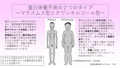 JUGEMテーマ:食事・栄養療法 【蛋白栄養不良の2つのタイプ】 蛋白栄養不良 protein calorie malnutritionには浮腫を伴う場合と浮腫は目立たず骨格筋の減少がみられる場合の2つのタイプがあります。 ?蛋白とカロリーの両方が不足すると、脂肪組織や筋肉組織を分解してエネルギーとなるケトン体やグルコースを産生し供給するようになります。 骨格筋からアミノ酸が放出されるので肝臓での蛋白合成は機能するので血清アルブミン値の低下が目立たず、浮腫が出現しない栄養障害をマラスムスmarasmusといい...