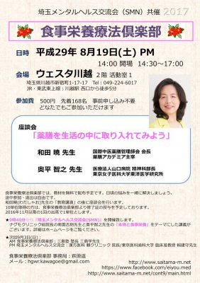 JUGEMテーマ:食事・栄養療法 【和田暁&奥平智之先生座談会】 食事栄養療法倶楽部2017in埼玉 平成29年8月19日(土)PM 14:00開場 14:30〜17:00 ≪今月はいつもと開始時間が異なります≫ 座談会 「薬膳を生活の中に取り入れてみよう」 ◯和田暁(わだしゃお)先生 国際中医薬膳管理師会 会長 薬膳アカデミア主宰 ◯奥平 智之 (おくだいら ともゆき)先生 医療法人山口病院 精神科部長 東京女子医科大学東洋医学研究所 新宿溝口ク...