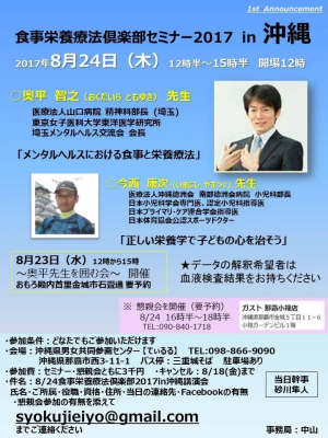 JUGEMテーマ:食事・栄養療法 〜奥平智之先生と今西康次先生を囲む会〜 食事栄養療法倶楽部2017in 沖縄 2017年8月23日(水) 12:00〜15:00 ≪座談会≫ ◎奥平 智之 (おくだいら ともゆき) 先生 医療法人山口病院 精神科部長 東京女子医科大学東洋医学研究 埼玉メンタルへルス交流会 会長 https://www.kamponavi.com/doctor/d65mizoguchi.html ◎今西 康次 (Yasutsugu Imanishi)(いまにし やすつぐ)先生 医療法人沖縄徳洲会南部徳洲会病院小児科部長所 日本小児科学会専門医、認定小児科指導医 ...