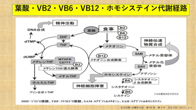 JUGEMテーマ:食事・栄養療法 【葉酸代謝とうつ病】 うつ病治療は薬物療法と心理療法が中心ですが,栄養療法として,葉酸を補薬として使用する治療の有効性が報告されています。 現在,食事から摂取できる栄養素の中で鬱病との関連が示唆されているのは,DHA・EPA・α-リノレン酸等の n-3 系脂肪酸,葉酸を含むビタミンB 群です。 葉酸は 1-C 代謝,いわゆるメチオニンの代謝系でメチル基を供給する重要な栄養素です。 経口摂取したアミノ酸から生じる有害なホモシステインの代謝には葉酸,ビタ...
