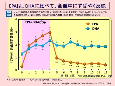 JUGEMテーマ:食事・栄養療法 【EPAとDHAの血中濃度の変化】 魚油(EPA2100mg+DHA1100mg/日)を4週間投与した後、投与を中止し、8週間何も投与しなかった場合のEPA・DHA組成を検討した結果。 魚油投与開始に伴って、全血中EPAはすばやく上昇しましたが、DHAはゆるやかな上昇にとどまっています。 また4週後、魚油投与中止とともにEPA含量は急激に低下しましたが、DHA含量は急激な低下は認められませんでした。 最近の研究によると、EPAは、濃度を維持するために絶えず補充する必要があると言われています。 ...