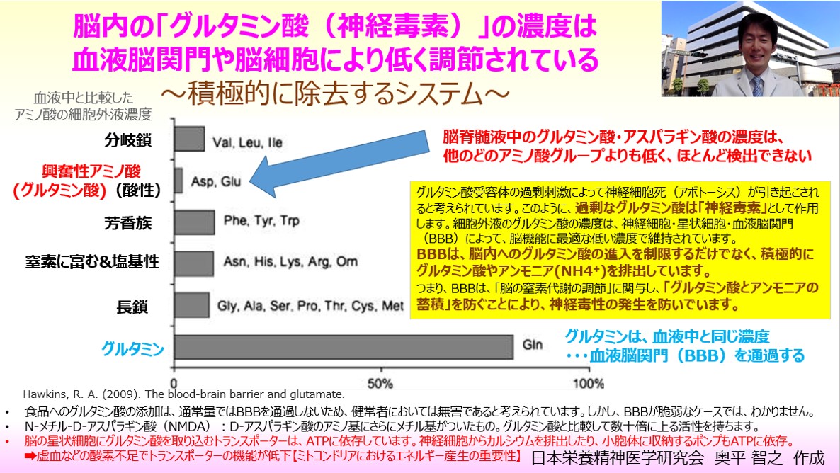 JUGEMテーマ:食事・栄養療法 https://www.dr-okudaira.com/post/glutamic_acid_as_a_neurotoxin グルタミン酸って聞いたことありますか? グルタミン酸と言えば、「化学調味料」や「酵母エキス」は、うまみ成分(グルタミン酸ナトリウム)が身近なものですね。 食品へのグルタミン酸の添加は、通常量ではBBBを通過しないため、健常者においては無害であると考えられています。 (ただし、BBBが脆弱なケースでは、わかりませんが・・・) 通常、食べ物から脳には直接行くことはありません。しかし、...
