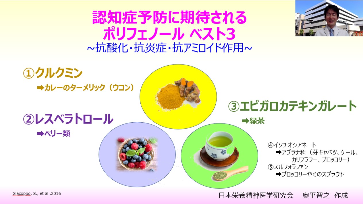 JUGEMテーマ:食事・栄養療法 https://www.dr-okudaira.com/post/polyphenols_and_dementia 認知症予防におけるポリフェノールのベスト3は、?クルクミン?レスベラトロール?エピガロカテキンガレートです。 ?クルクミン:カレーのターメリック(ウコン)の黄色のもと ?レスベラトロール:ベリー類 ?エピガロカテキンガレート:緑茶 《?クルクミン》 クルクミンは、ショウガ科に属します。皮膚や筋肉の炎症を治すための薬草療法として、伝統的なインド医学や漢方薬で何世紀にもわたっ...