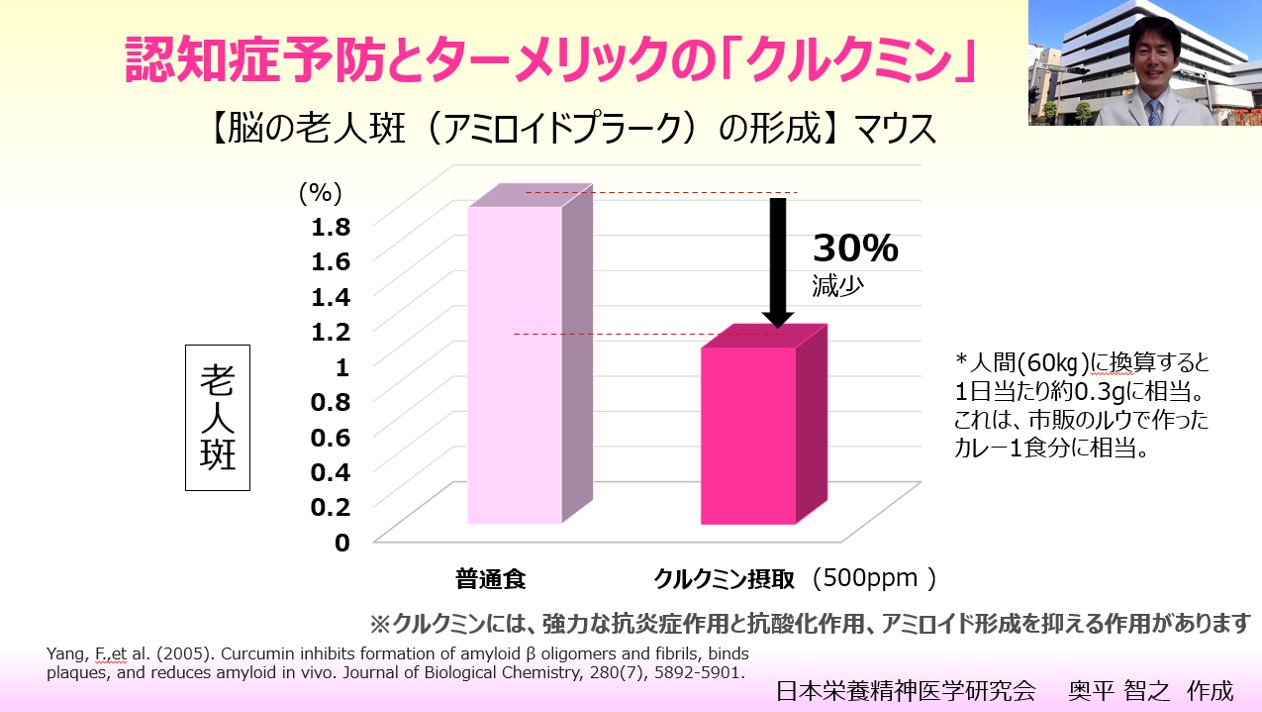 JUGEMテーマ:食事・栄養療法 https://www.dr-okudaira.com/post/curcumin_and_amyloid_plaque クルクミンは、黄色の色素です。低用量で食用に広く使用されており、伝統的なインドの「アーユルヴェーダ」薬では、通常はターメリック抽出物として高用量で広く使用されています。 カレーのスパイスとして使われている「クルクミン」には、強力な抗炎症作用と抗酸化作用、アミロイド形成を抑える作用があります。 進行したアミロイド蓄積を伴う老化したマウスにクルクミンのエサを与えると、クル...