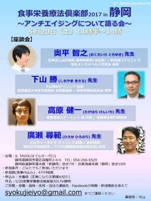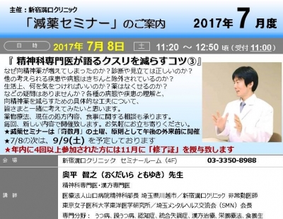 JUGEMテーマ:食事・栄養療法 主催:新宿溝口クリニック 「減薬セミナー」のご案内 2017年7月度 日時:2017年7月8日(土)11:20〜12:50頃(受付11:00) 『精神科専門医が語るクスリを減らすコツ?』 参加費3,000円(当日受付にて) どなたでもご参加いただけます 事前予約が必要となります(先着約30名) ※お申込書をダウンロードしていただき、 太枠内に必要事項をご記入の上、 FAX:03-3350-6998 にてお申込み下さい 新宿溝口クリニック TEL:03-3350-8988 Dr....