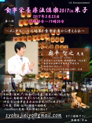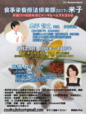 JUGEMテーマ:食事・栄養療法 【食事栄養療法倶楽部2017inいわき(福島)】 〜Dr.奥平の栄養解析講座〜 2017年7月19日(水) 10時〜13時(9:45会場) ≪教育講演≫ 奥平 智之(おくだいらともゆき)先生 医療法人山口病院 精神科部長 (埼玉県) 東京女子医科大学東洋医学研究所 新宿溝口クリニック 埼玉メンタルへルス交流会 会長 https://www.kamponavi.com/doctor/d65mizoguchi.html ☆Dr.奥平 プロフィール☆彡 ★Dr.奥平 講座案内★ ☆Tw...