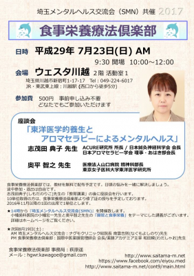 JUGEMテーマ:食事・栄養療法 【座談会】志茂田典子&奥平智之先生 食事栄養療法倶楽部2017in埼玉 平成29年7月23日(日)AM 9:30開場 10:00〜12:00 「東洋医学的養生とアロマセラピーによるメンタルヘルス」 ◯志茂田 典子 (Noriko Shimoda)(しもだのりこ)先生 ACURE研究所 所長 日本鍼灸神経科学会 会長 日本アロマセラピー学会 理事・あはき部会長 ◯奥平智之(おくだいらともゆき)先生 医療法人山口病院 精神科部長 東京女子医科大学東洋医学研究所 新宿溝口クリニック https://www....