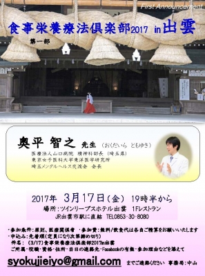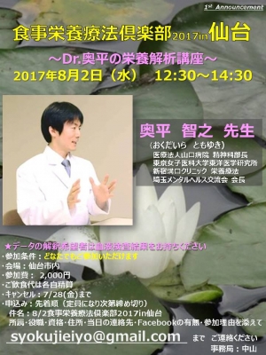 JUGEMテーマ:食事・栄養療法 【食事栄養療法倶楽部2017in仙台】 〜Dr.奥平の栄養解析講座〜 日時:2017年8月2日(水) 12:30〜14:30 ○奥平 智之 先生 (おくだいら ともゆき) 医療法人山口病院 精神科部長 東京女子医科大学東洋医学研究所 新宿溝口クリニック 埼玉メンタルへルス交流会 会長 https://www.kamponavi.com/doctor/d65mizoguchi.HTML https://www.kamponavi.com/m/doctor/d13yama.html ...