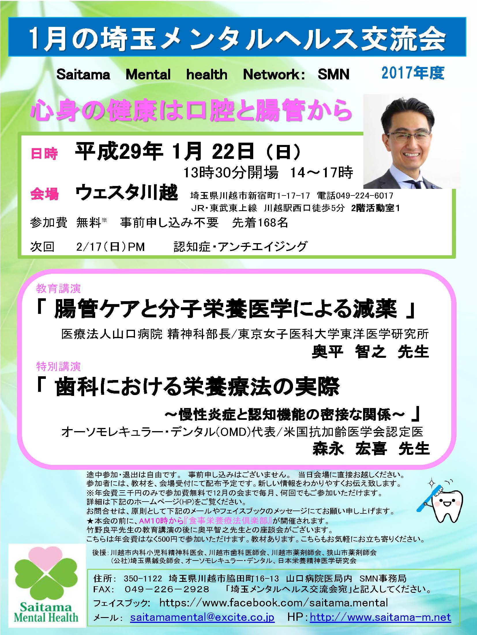 JUGEMテーマ:食事・栄養療法 【森永宏喜先生&奥平智之先生講義:埼玉メンタルヘルス交流会のご案内】 2017年1月のセミナーは、 “心身の健康は口腔と腸管から” がテーマです。 ◎心身の健康は口腔と腸管から◎ 〜プログラム〜 《教育講演》「 腸管ケアと分子栄養医学による減薬 」 奥平智之(おくだいらともゆき)先生 医療法人山口病院 精神科部長/東京女子医科大学東洋医学研究所 新宿溝口クリニック 《特別講演》「 歯科における栄養療法の実際〜慢性炎症と認知機能の密接な関係〜 」 ...