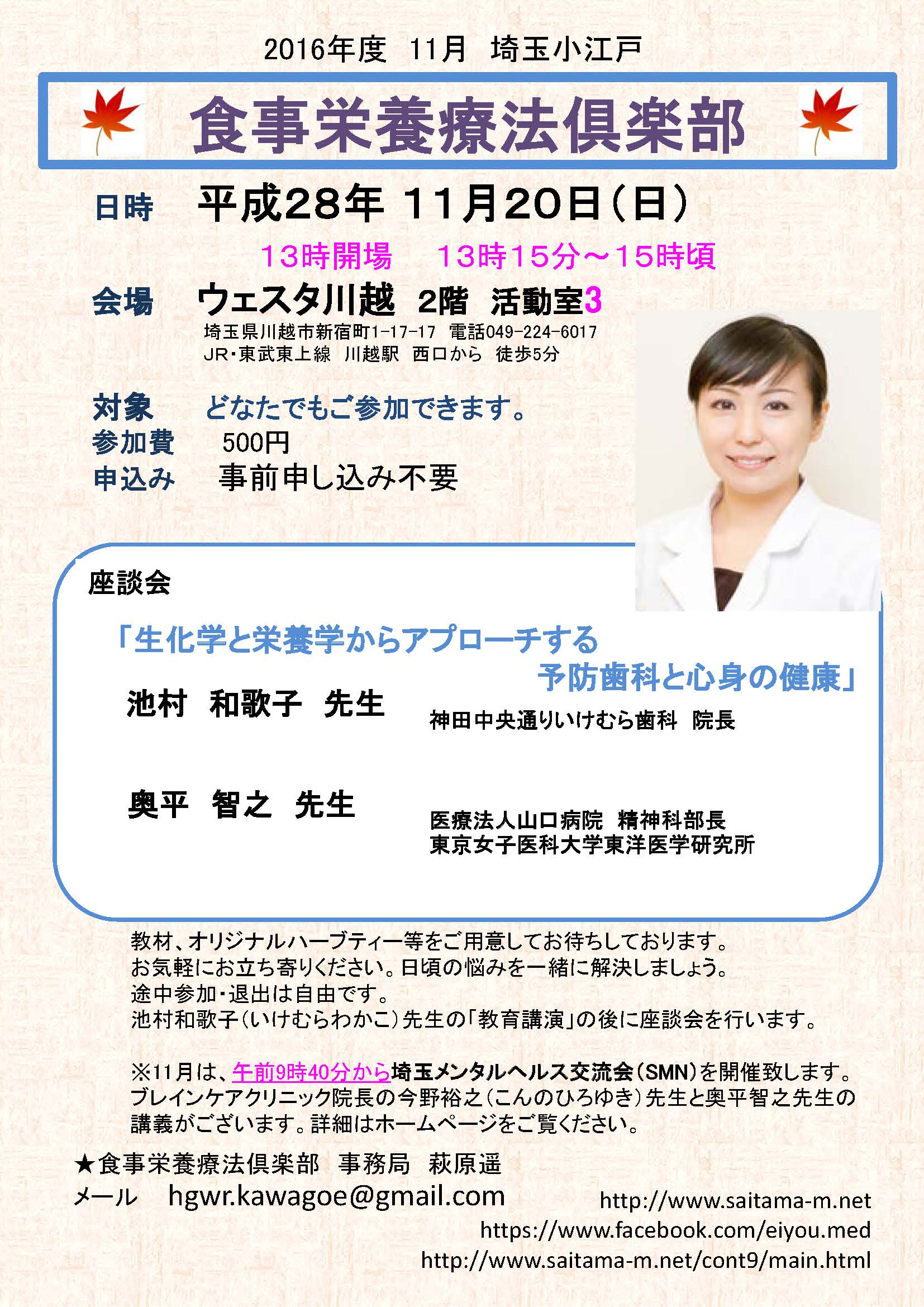 JUGEMテーマ:食事・栄養療法 【池村和歌子 (いけむらわかこ)先生】教育講演のご案内 食事栄養療法俱楽部2016.11.20 in 埼玉 2016年11月20日(月・祝日) 13時開場 13時15分〜15時頃 ※11月のみ、午後13時から開催します! 会場 ウェスタ川越 2階 活動室3 埼玉県川越市新宿町1-17-17 電話0492246017 JR・東武東上線 川越駅 西口から 徒歩5分 http://www.westa-kawagoe.jp/access 対象 どなたでもご参加できます。 参加費...
