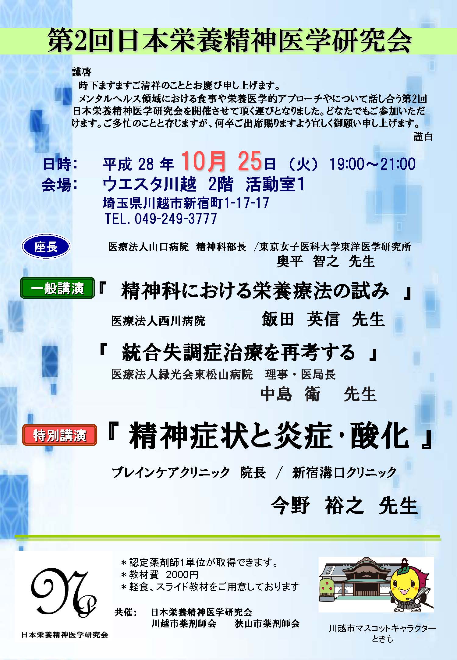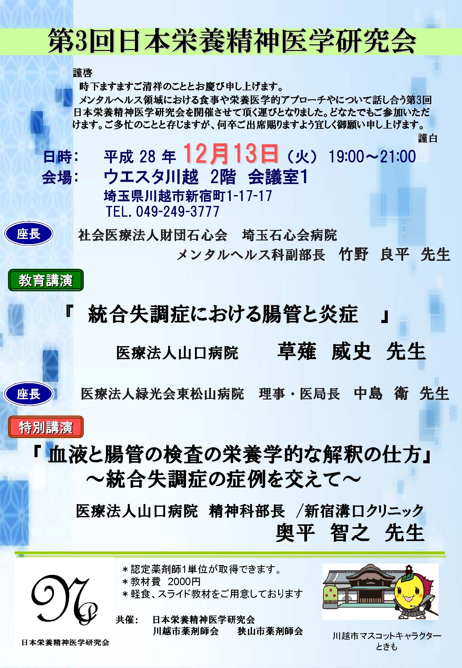 【第3回日本栄養精神医学研究会2016in埼玉のご案内】 JaNP:Japanese society of Nutritional Psychiatry http://www.j-np.net 平成 28 年 12月13日 (火) 19:00〜21:00 ウエスタ川越 2階 会議室1 埼玉県川越市新宿町1-17-17 TEL. 0492493777 〜プログラム〜 [座長]竹野良平(たけのりょうへい) 先生:社会医療法人財団石心会 埼玉石心会病院 メンタルヘルス科副部長 [教育講演]『統合失調症における腸管と炎症』草薙威史(くさなぎたけし) 先生:医療法人山口病院 [座長]中島衛(なかじままもる)先生:医療法...
