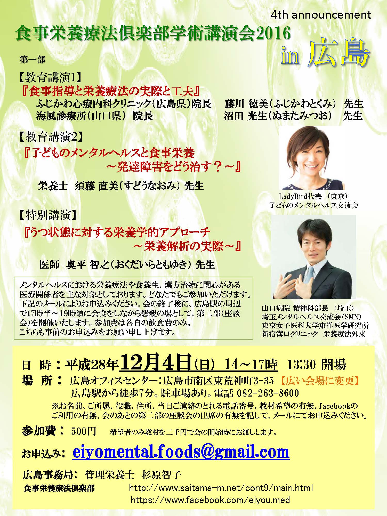 JUGEMテーマ:食事・栄養療法 〜食事栄養療法俱楽部2016学術講演会in広島〜 日 時 : 平成28年12月4日(日) 14〜17時 13:30 開場 【教育講演1】 『食事指導と栄養療法の実際と工夫』 藤川 徳美(ふじかわとくみ)先生 ふじかわ心療内科クリニック(広島県)院長 沼田 光生(ぬまたみつお)先生 海風診療所(山口県) 院長 【教育講演2】 『子どものメンタルヘルスと食事栄養〜発達障害をどう治す?〜』 須藤直美(すどうなおみ)先生 LadyBird代表 (東京都) ...