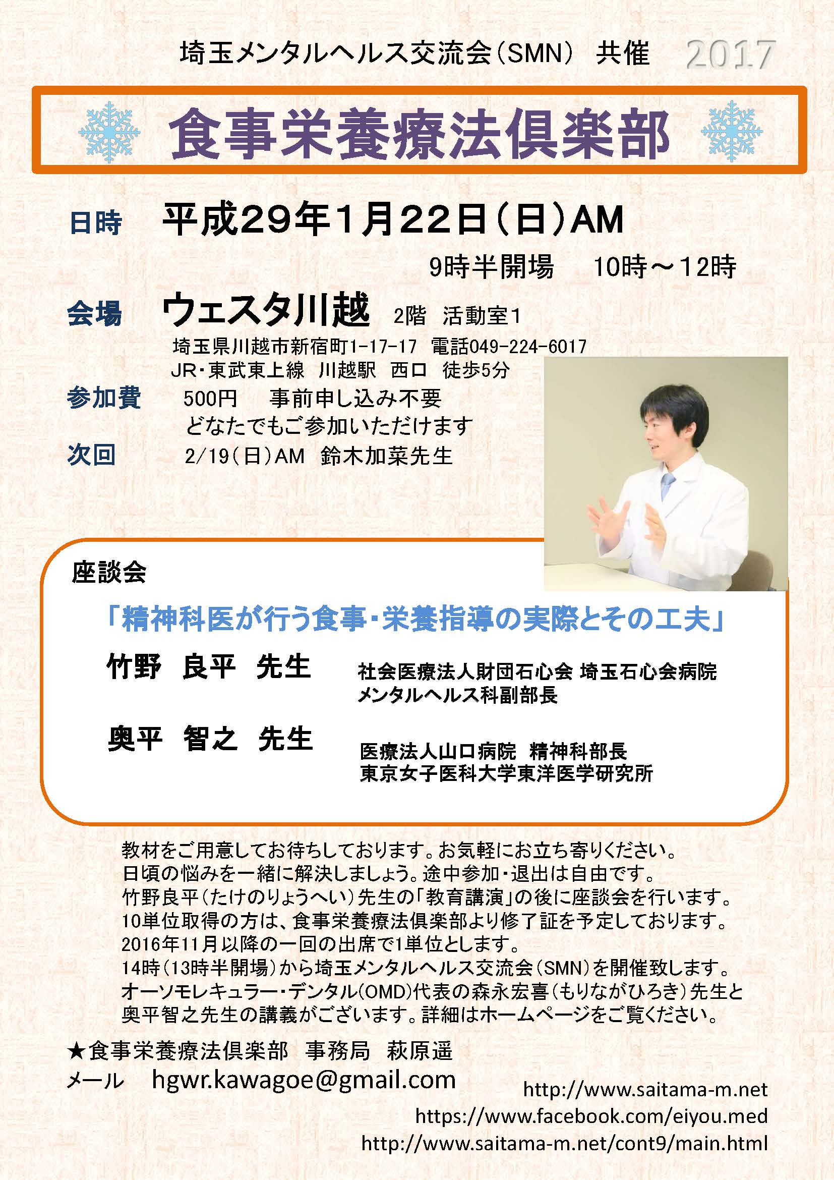 JUGEMテーマ:食事・栄養療法 【竹野良平先生&奥平智之先生 座談会】食事栄養療法俱楽部2017 平成29年1月22日(日) AM9時半開場10時〜12時 ウェスタ川越 2階 活動室1 埼玉県川越市新宿町1-17-17 電話0492246017 JR・東武東上線 川越駅 西口から徒歩5分 対象 どなたでもご参加できます。 参加費 500円 申込み 事前申し込み不要 『精神科医が行う食事・栄養指導の実際とその工夫』 竹野良平(たけのりょうへい)先生:社会医療法人財団石心会 埼玉石心会病院メンタルヘルス...