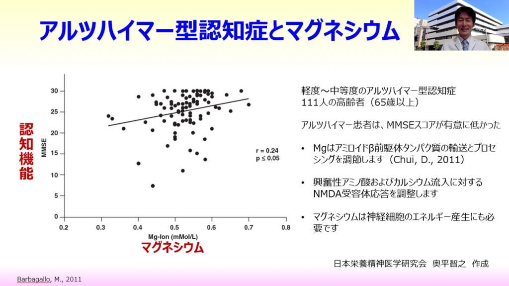 https://www.dr-okudaira.com/post/magnesium_and_dementia JUGEMテーマ:食事・栄養療法 軽度〜中等度のアルツハイマー型認知症の 111人の高齢者(65歳以上)を対象にした研究です。 アルツハイマー患者は、認知症スクリーニング検査であるMMSEスコアが有意に低いと言う結果でした。 Barbagallo, M., et al(2011). Altered ionized magnesium levels in mild-to-moderate Alzheimer's disease. Magnesium Research, 24(3), 115-121. •マグネシウムは、ア...