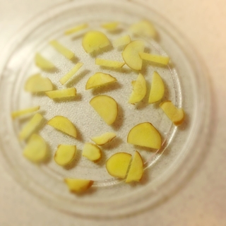JUGEMテーマ:冷え性 そしてもう1つ。内側からのアプローチ。 冷え性に効果バツグンの生姜紅茶を飲む為に、乾燥しょうがを作りました! 作り方は、こちらを参考にさせて頂きました。★(クックパッドに飛びます) まずは、しょうがを切って耐熱皿に直に並べて電子レンジでチン! 簡単! リンク先では、600Wで7〜8分との事でしたが、我が家の電子レンジでは4分くらいにしました。 検索したら、電子レンジでやると生姜から火が出た(!)なんて話もありますので、電子レンジの前で監視しつつが良いでしょう◎ ...
