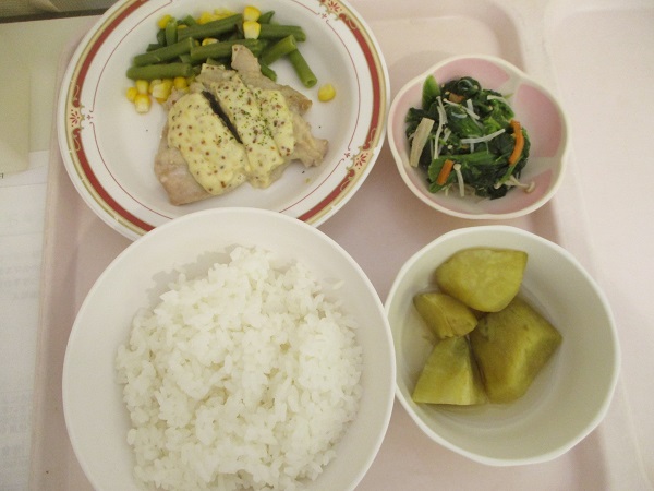 入院13日目。 昼食を頂きました。 鶏肉のマスタード焼。 マスタードの風味がよくてお肉も美味しかった♪ さつま芋の甘煮 胡麻和え。 野菜は小松菜とにんじん、もやし。 JUGEMテーマ:病院へいこう!