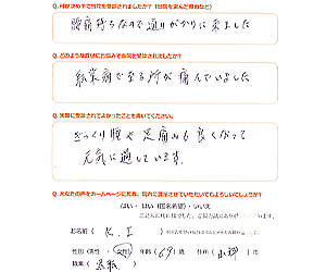 みなさんおはようございます!京都市山科区の渋谷街道沿いにあるじとう接骨院の院長、地當です。腰痛・足の痛みでお悩みの患者さんから感想を頂きました。 69歳 女性 主婦 【腰痛】 Q.何が決め手で当院を受診されましたか?(当院を選んだ理由など) 腰痛持ちなので通りがかりに来ました。 Q.どのような症状にお悩みで当院を受診されましたか? 職業病で至る所が痛んでいました。 Q.実際に受診されてよかったことを書いてください。 ぎっくり腰や足痛みも良くなって元気に過ご...